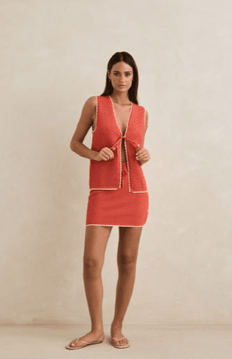 Soft and vibrant, the Gigi Knit Mini Skirt in Red features a relaxed A-line fit, drawstring waist, and scalloped hem edge. Perfect for pairing back with the matching vest.